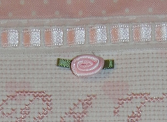 Tela con fondo de cuadros en color rosa, pasamanería al tono, con lazo de raso y detalle de flor.