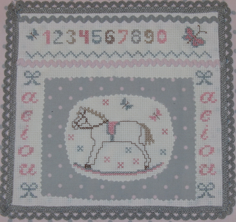 Aquí teneis otro trabajo, con motivos infantiles. Puede ser personalizado a vuestro gusto, pudiendo poner el nombre del bebe, la fecha de nacimiento...