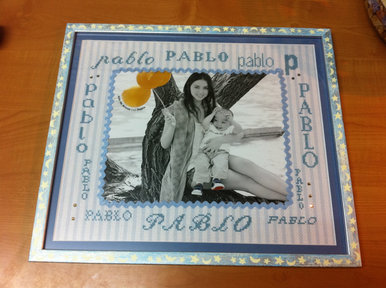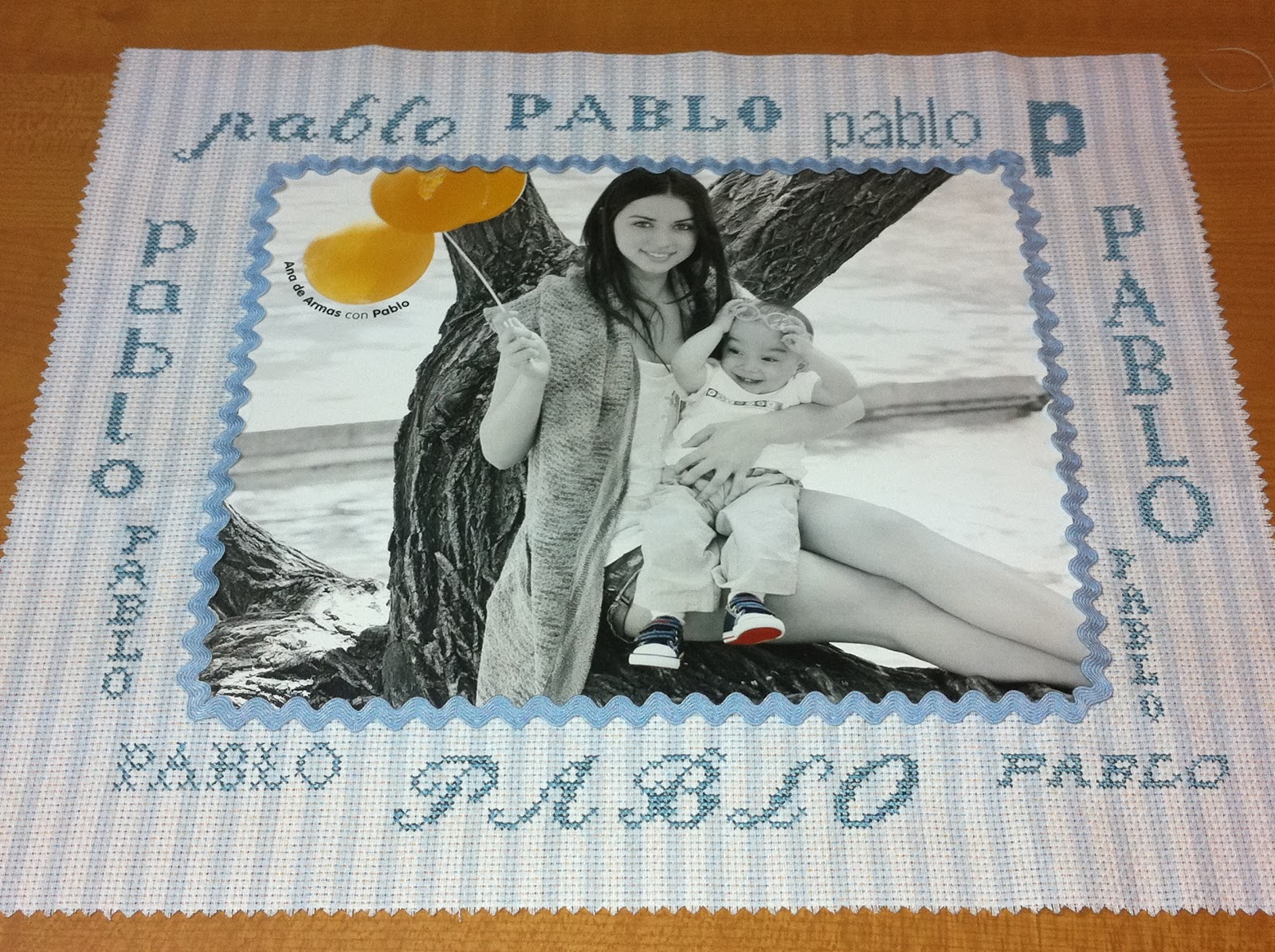 Como podéis apreciar, he utilizado la tela de DMC, en la versión de rallas en tonos azules y blanco; y la he decorado con en nombre de Pablo, en diferentes ilustraciones de letras, y cinta azul, y para finalizar con pequeños swaroski en tonos amarillos, a juegos de los globos de la fotografía.