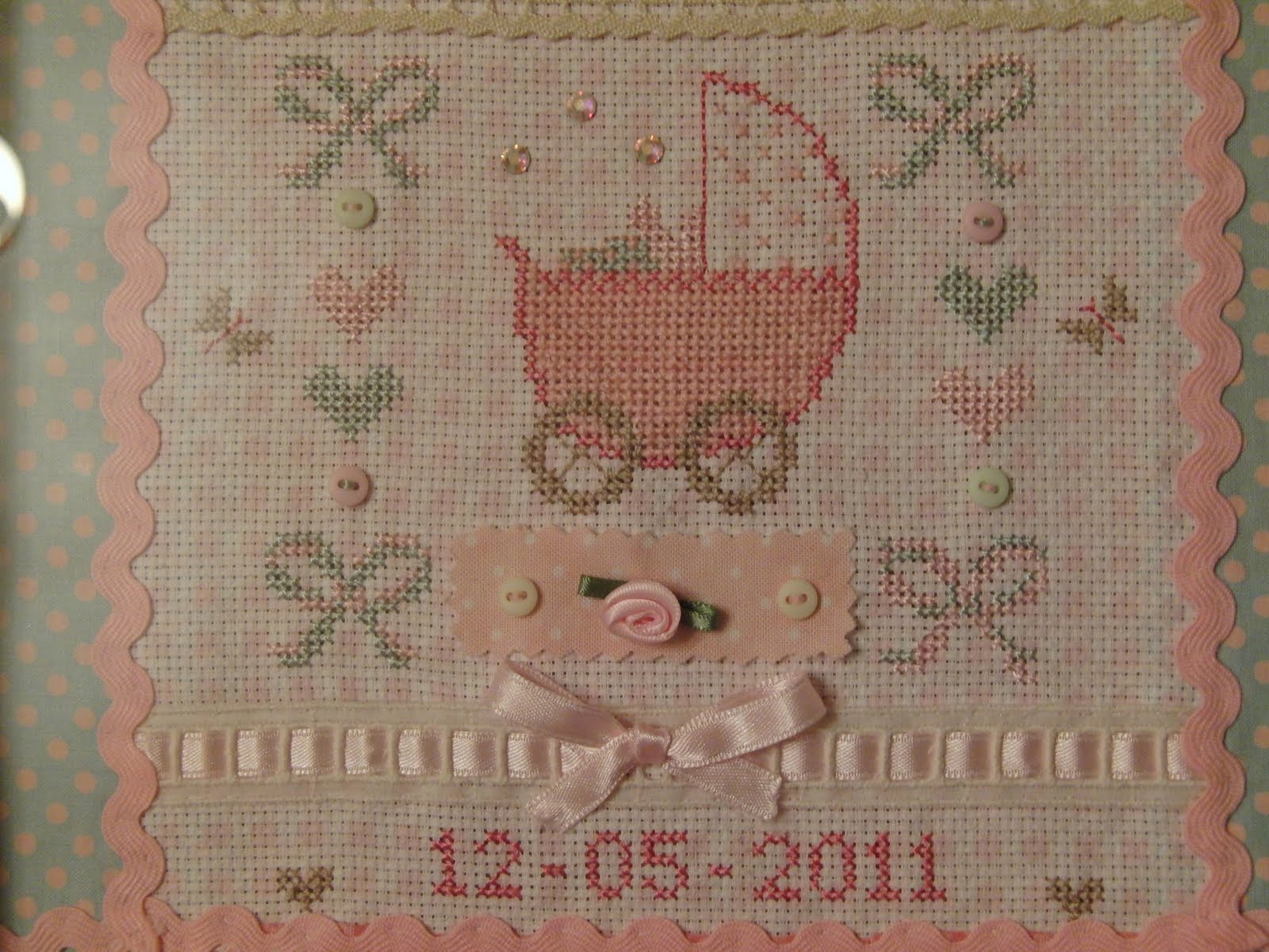 Realizado con motivos de nacimiento, pasamanería, lazo, swaroski, entredos, y unos detallitos de piecezitos, botones de colores al tono del trabajo, flor de raso rosita; y de fondo tela de topitos en color rosa, y fondo azul turquesa. La tela DMC, en cuadritos rosas y blancos.
