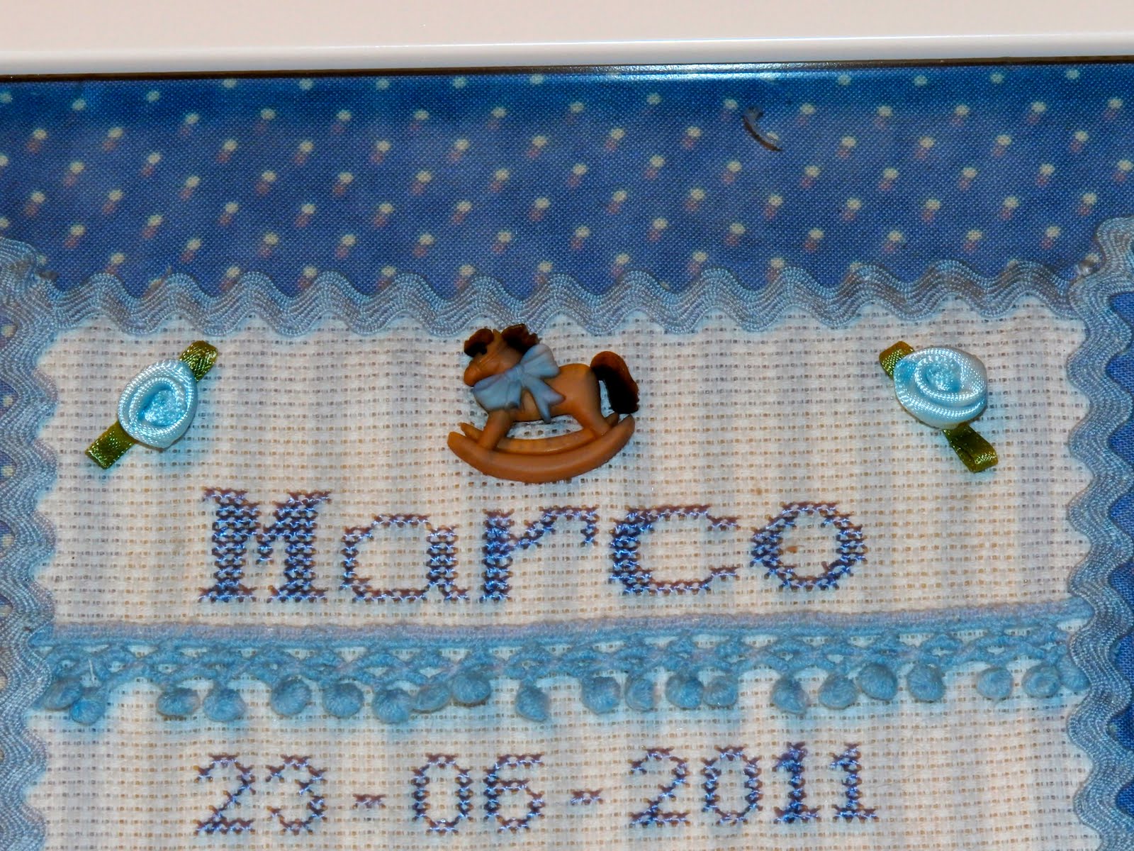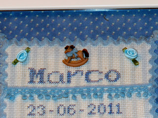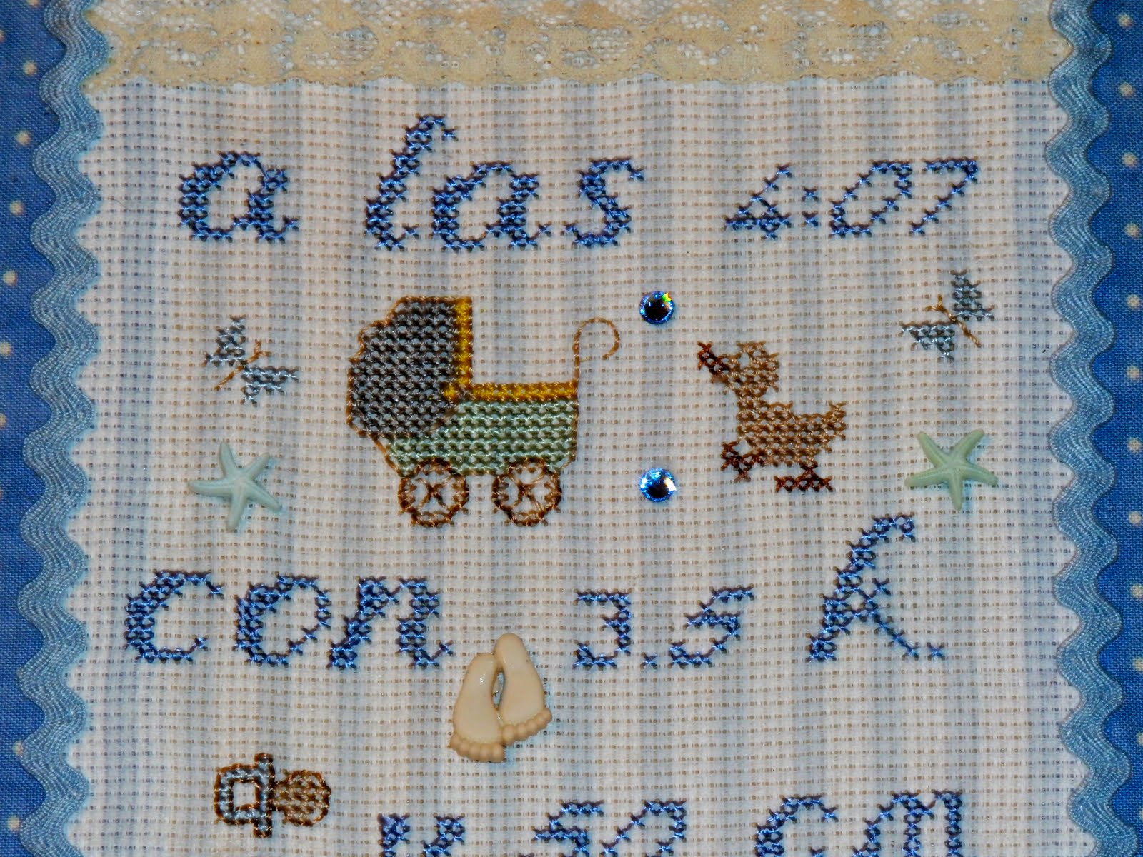 Esta vez he ulilizado tela DMC, de rallas azul y blanco y lo he decorado con una puntilla en tono crudo, pequeños botones de colores, piquillo azul, swarosvki de color azul, estrellas, conchitas, un piececitos, flores de raso, y arriba un caballito. Y al pie del cuadro con pasamanería y lazo azul de raso.